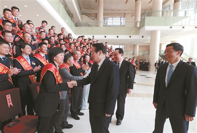 | 省领导亲切接见受表彰的劳模先进。 记者邹伟锋 摄 |