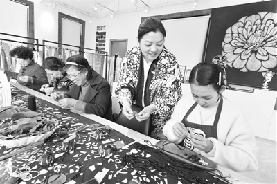 近日,在宁波市奉化区西坞街道雷山村的喜曼蓝富非遗共富工坊内,浙江纺织服装职业技术学院副教授、蓝印花布印染技艺代表性传承人张剑峰身着传统技艺植物印染的裙子,手拿新印染蓝布,给妇女们讲解蓝印花布的印染、制作、设计等课程,赋能乡村振兴。