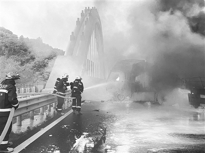 近日,受强对流天气影响,衢州出现雷阵雨天气,并伴有短时强降水和6~8级雷雨大风。5月5日早上5点多,一辆运沙的半挂车在途经衢州市柯城区351国道石梁溪大桥时,因雨天路滑车子突然失控,车头撞到护栏后不慎起火蔓延。所幸消防员及时赶到,成功扑灭了火势。