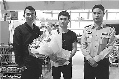 | 横峰街道相关负责人和民警一起给陈涛送上鲜花和荣誉证书。 |