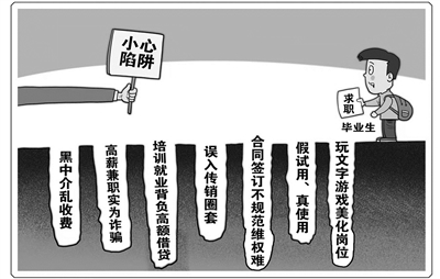 当前正值求职季,高校毕业生即将走向职场。在收获岗位录用通知的同时,大家也要小心求职骗局。朱慧卿 作