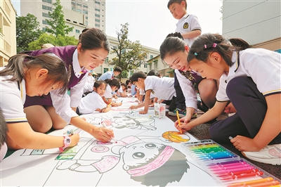 活动中,高铁乘务员和铁路乘警分别为小学生普及铁路发展史,宣传高铁乘车安全知识。同学们则用手中的画笔,和铁路的叔叔阿姨们一起,共同将学到的知识绘制成“迎亚运十米画卷”,以此来迎接亚运会的召开。