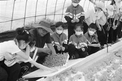 日前,舟山普陀区六横镇中心小学利用午休时间组织部分学生,到当地五星村村民王林辉的蔬菜种植大棚里去学习无土栽培和水培等蔬菜种植知识及种植技术,让大家亲身体验科学技术给农业带来的好处。“没想到,王伯伯不用泥土、不施化肥、不打农药都能种出蔬菜来,而且还是纯绿色蔬菜,每一个环节都离不开科技支撑,我们今天学习到了宝贵的农学知识。”孩子们兴奋地说。