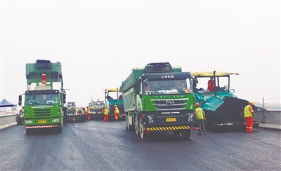 | 在杭绍甬高速杭绍段终点上虞区盖北互通附近,工人们正在摊铺沥青。 |