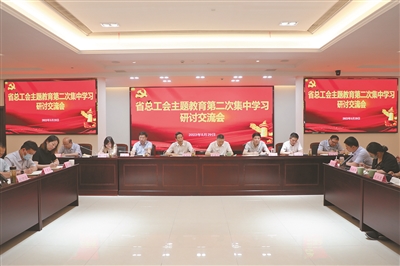 本报讯 记者李国峰摄影报道 以学铸魂、以学增智、以学正风、以学促干。近日,省总工会机关主题教育读书班第二次集中学习研讨交流会举行。会议强调,要高标准高质量推进主题教育,在围绕中心服务大局中发挥工会组织独特优势和重要作用,以主题教育新成效推动工会工作新发展。