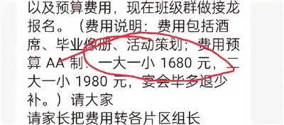 “毕业晚宴接龙报名,一大一小1680元,二大一小1980元,多退少补。”近日,温州一所高中的毕业班家长群截图在网络传播。