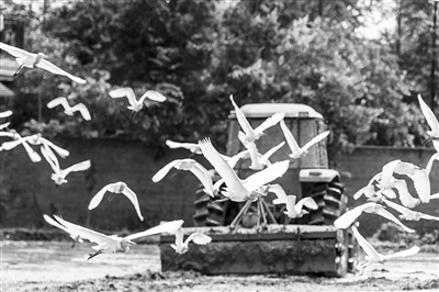 世界环境日当天(6月5日),衢州市柯城区万田乡炉头村的一丘稻田里,拖拉机手在翻耕收获了油菜的田地,准备种植中稻。成群的牛背鹭(白鹭的一种),追逐着拖拉机翻飞觅食,呈现出一幅人与自然、人与鸟的和谐图景。