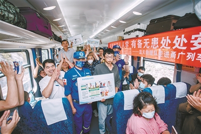 本报讯 通讯员陈美芳、肖坤摄影报道 今年6月是第 22 个全国安全生产月,日前在K210 次列车上,陈美芳劳模工作室联合蓝天救援队开展“应急知识人人学 、有备无患处处安”安全主题活动,将宣传安全知识的课堂搬到了移动的列车上。
