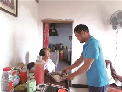 值得一提的是,对行走不便的老人,会有志愿者化身“爱心厨娘”,上门送餐。图为村干部陈望忠为92岁的蔡夏梅老太太送中餐。
