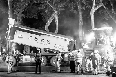 | “杯水不溢” 聚焦行车体验 利用高韧性超薄沥青技术,首次采用四台同步摊铺机同时摊铺,有效解决道路冷缝和平整度问题,仅历时4晚完成南山路路面铺设3.4万余平方米。通讯员朱华军 摄 |