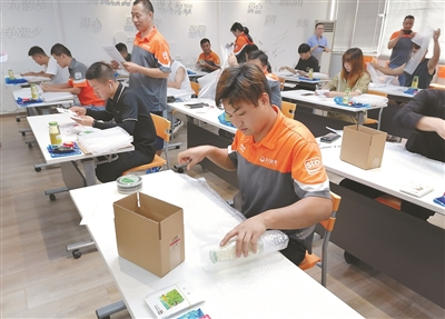 赛场上,申丰快递公司20多名快递员同台竞技,比赛分理论知识与实际操作,内容涵盖交通安全法规、收寄验视安检、危险化学品识别、易碎品打包、称重及运费计算、规范操作等方面技能。