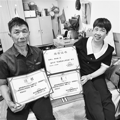 | 彭辉义、谭秋梅夫妇展示他们的获奖证书。 |