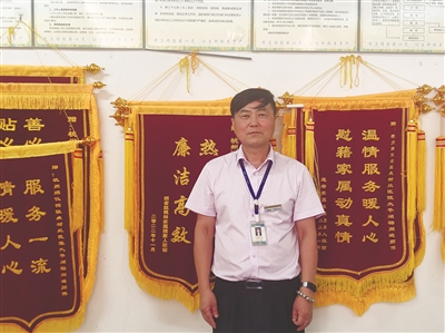 | 杨同进背后挂满逝者家属赠送的锦旗。 记者张浩呈 摄 |