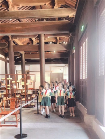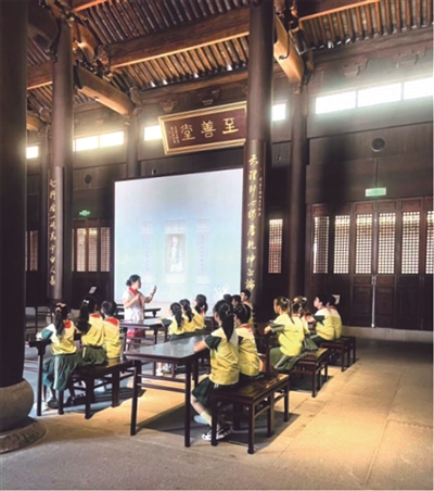 至善堂内,同学们坐在课桌前,仿佛穿越到500多年前,聚精会神地聆听先生讲课。在东跨院,由16个小故事组成的东阳木雕画,展现了王阳明跌宕起伏的一生,同学们宛如身临其境,为阳明先生平定宁王叛乱拍手欢呼,为先生病逝于路上、留下“此心光明,亦复何言”而神伤。