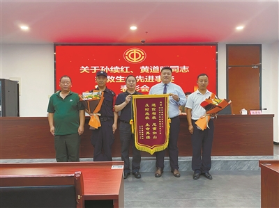 7月18日下午,省职工服务中心召开表彰大会,对孙续红和黄道明进行表彰。获救男子的亲属代表唐夫玉也到场送上了“及时施救、生命再续”的锦旗和鲜花表示感谢。据了解,该男子名叫邢启普,山东人,这次是来省职工服务中心应聘保安,没想到在应聘过程中突发心梗。中心和物业公司人员去医院看望时,邢启普的妻子一再感谢:“多亏了你们及时抢救,挽救了我丈夫的生命。医生在病房外告诉我,如果不是在救护车到来之前你们坚持心肺复苏,他很可能就抢救不过来了。”