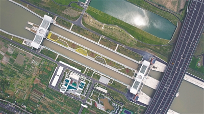 | 7月18日,杭州市八堡船闸正式启用,标志着京杭运河杭州段二通道通航。这是浙江省建设现代化内河航运体系示范省的最新动作。未来,千吨级船舶可直达杭州进入钱塘江,浙北、浙东及浙中西部的航道完全贯通成高等级内河水运网,这条奔涌千年的黄金水道将迎来华丽复兴,杭州真正实现“通江达海”。图为鸟瞰八堡船闸。 记者邹伟锋 摄 |