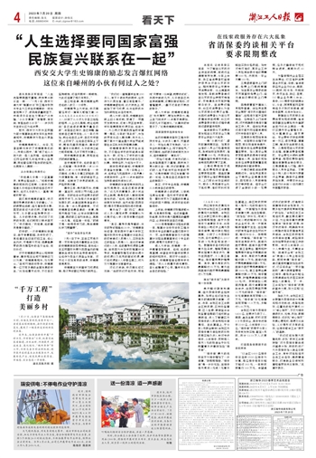 | 7月17日,仙居县下各镇杨砩头村,白墙瓦黛的民房整齐划一,房前屋后绿树掩映,汤归湖碧水映蓝天,展现了一幅清新美丽的新农村画卷。 近年来,仙居县持续开展“千村示范、万村整治”工程,统筹实施农房翻建、污水治理、河湖提升、村道改善、亮化绿化、“厕所革命”等工作,不断完善乡村治理机制,稳步提升农村基本公共服务水平,发展特色产业,使农民群众获得感、幸福感、安全感进一步增强。 通讯员陈月明 摄 |