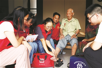 昨日,德清县乾元镇明星村,家庭医生为94岁、曾参加抗美援朝战争的老兵沈阿土(右二)检查身体。