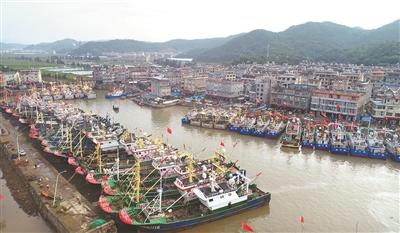 昨日,在玉环市灵门避风港,来自玉环当地及温岭部分渔船靠泊在封闭式无风浪的港湾内。