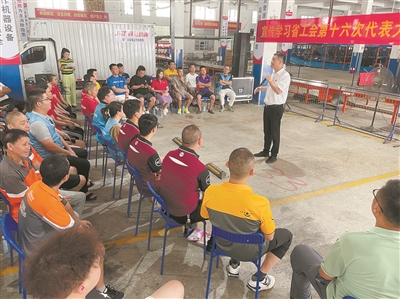 图为省工会第十六次代表大会代表、椒江区总工会党组书记、常务副主席任炎旭正在为广大职工传达省工会第十六次代表大会精神。