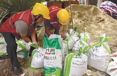 昨日中午,在玉环市龙溪镇龙翔路一侧,该镇蕲春党建工作站的流动党员正在灌装沙包,备足防风雨物资设备,及早防备台风“卡努”。