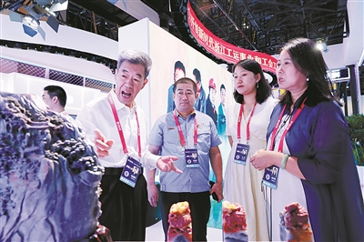 | 钱高潮(左一)向兄弟省市工匠代表介绍鸡血石雕作品。记者邹伟锋 摄 |