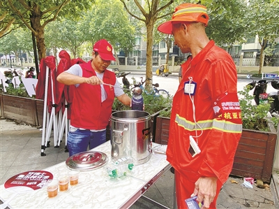 | 近日,杭州市拱墅区祥符街道阮家桥社区以“喜迎亚运送清凉 暖‘新’关爱沁人心”为主题,举行户外作业人群高温慰问活动,为辖区一线户外劳动者送去关心关爱,带给新就业形态劳动者“清凉一夏”。 图为社区志愿者为环卫工人送上绿豆汤。 记者邹伟锋 通讯员孙菁 摄 |
