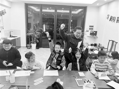 马佳良身着唐装,用手比划着剪刀的样子在空中“起舞”,贺知章的两句“不知细叶谁裁出,二月春风似剪刀”就这样生动形象地展现在孩子们面前。两个小时的课程,马佳良与孩子们吟诗作对,畅所欲言。
