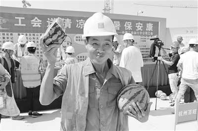 | 近日,中建二局浙江分公司工会联合安吉建控集团“两山”未来科技城项目临时党总支、安吉县公安局昌硕派出所开展以“送清凉物资”“送政策宣传”“送健康培训”“送法律维权”为主要内容的“四送”活动。为中建二局安吉未来科技城财富中心EPC项目的1200余名建筑工人,送去清凉慰问及普法宣传,维护广大工友在高温季节的安全健康权益。图为工友品尝西瓜等消暑食品。 记者邹伟锋 通讯员张宇楠 摄 |