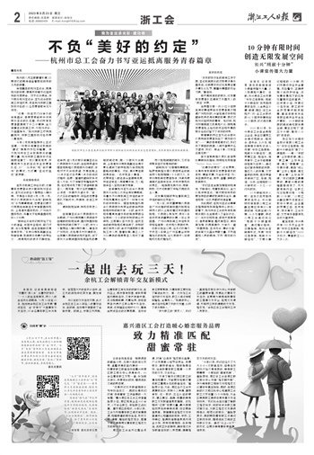 “这是我们交友联谊相亲系列专场活动之一,同时也是我们打造‘浙有善育’工作品牌的一大举措。”嘉兴港区总工会工作者崔晓萍介绍,港区现有企业600余家,2万余名职工,年轻职工占比高。基于港区的现状,今年以来,工会为引导青年职工追求爱情美满、和睦幸福的美好生活,形成文明、健康、理性的婚恋观念,搭建了港区单身男女青年职工婚恋交友的服务平台。