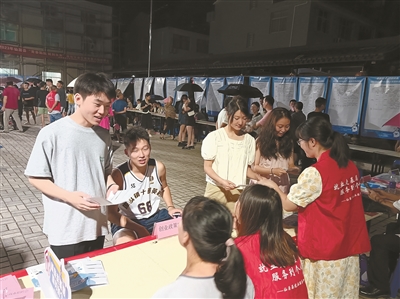 本报讯 通讯员杨钗灵 记者潘仙德摄影报道 近日,仙居县总工会携手县人社局和埠头镇人民政府借“村BA”比赛之机,在埠头镇振兴村的篮球赛现场举办了“青春助航 就创未来”高校毕业生第六场人才夜市招聘会。