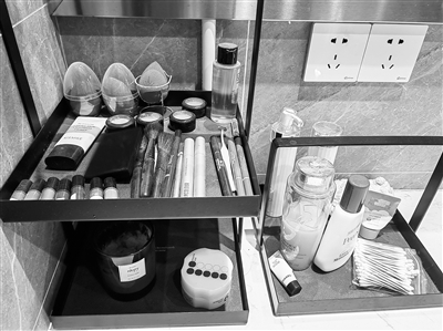 | 化妆区有各类护肤、彩妆产品。 记者程雪 摄 |