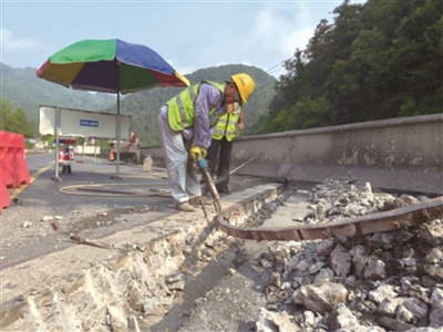 8月20日,开化城白线枧坑畈二桥桥头,开化县公路港航与运输管理中心池淮公路站的养护人员,头顶烈日忙着修复桥面伸缩缝,确保路面平整,行车舒畅,助力全国文明城市创建。