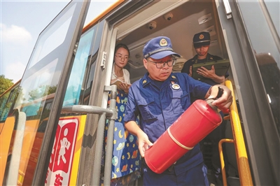 新学期开学在即。连日来,德清县钟管镇联合教育、消防、应急等部门,组织专业人员对校车、校园消防设施以及用电安全等方面进行全面“体检”,排除隐患,确保安全。图为相关人员检查校车消防设施。