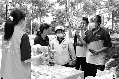 | 镇海工会志愿者向过路的快递小哥发放清凉饮料和水果。 |
