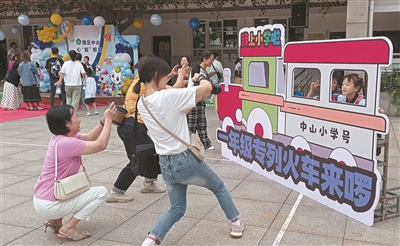 昨日早上,在江山市中山小学校门口,前来报到的一年级新生背着书包在家长带领下,纷纷在学校设立的背景板处打卡,留下这一珍贵的成长瞬间。通讯员金超水 摄