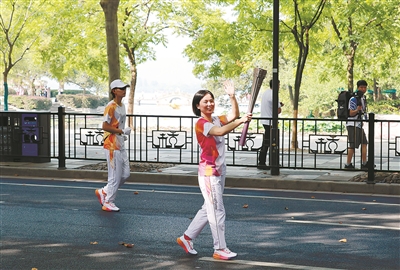 | 徐川子在传递火炬。 记者邹伟锋 摄 |
