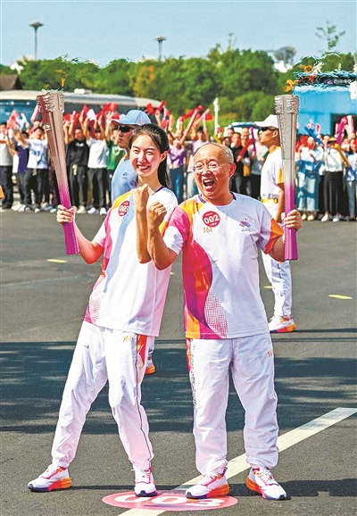| 9月12日,火炬手崔译文(左)和钱海军在火炬传递中。当日,杭州亚运会火炬在宁波传递。新华社记者孙非 摄 |