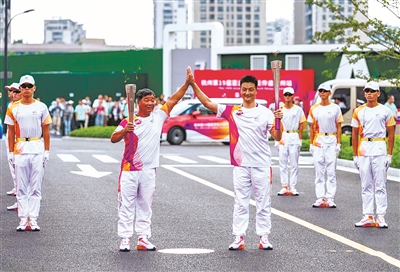| 昨日,火炬手郭文标(左)和吕义聪在火炬传递中。当日,杭州亚运会火炬在台州传递。 新华社记者孙非 摄 |