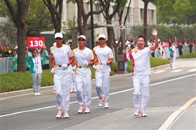 | 第130棒火炬手浙江省特级教师洪方煜(右一)。 通讯员孙金标 摄 |
