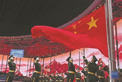 | 9月23日,第19届亚洲运动会开幕式在杭州举行,中华人民共和国国旗在开幕式上升起。新华社记者江汉 摄 |