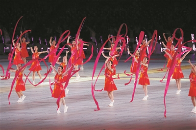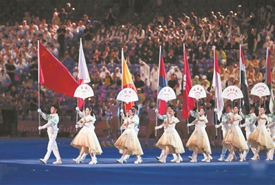 | 9月23日,各代表团旗手和礼仪志愿者在开幕式上入场。 新华社记者李一博 摄 |