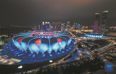 夜幕下,坐落在钱塘江畔的杭州奥体中心体育场华灯璀璨,流光溢彩。这座形如一朵大莲花的建筑,见证着亚运圣火第三次在中国点燃。