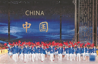 场地中呈现出大好河山的壮阔景象,一条红绸铺展开来,伴着《我爱你中国》的深情旋律,8名仪仗兵迈着坚定的步伐,护卫着中华人民共和国国旗走进现场。全场起立,高唱中华人民共和国国歌。五星红旗冉冉升起,迎风飘扬。
