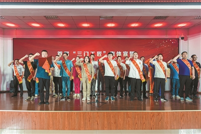 近日,由三门县总工会主办的“匠心筑梦 建功港城”——首届“三门工匠”颁奖活动在三门县技师学院举行。25名首届“三门工匠”获得者进行集体宣誓,他们将以这次颁奖活动为新的起点,继续大力弘扬劳模精神、劳动精神、工匠精神,用匠心印记“时代三门”。通讯员何单琦 摄