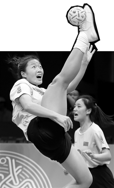 | 10月2日,杭州第19届亚运会藤球女子四人预选赛,中国队选手陈艳(前)在比赛中。 |
