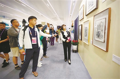 最近,杭州亚运会主媒体中心里,一个“西湖美”的画展引起了诸多国内外记者的强烈兴趣。