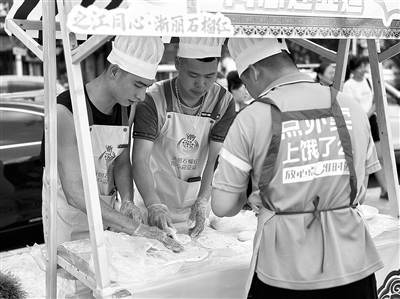 本报讯 记者金钧胤报道 近日,在青田县瓯南街道石门社区工会组织开展的“风味传承”民族美食大赛上,由快递小哥和外卖小哥组成的“青蜂侠”代表队格外抢眼。