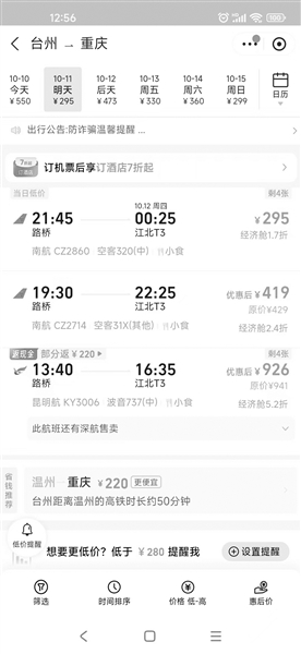 笔者在携程旅行、飞猪旅行以及去哪儿等线上旅游平台发现,10月10日,台州飞武汉最低2折,即200元;台州飞贵阳最低1.6折,即240元;台州飞重庆最低1.9折,即335元……此外,台州飞大连、昆明等航班价格,单程最低500多元。