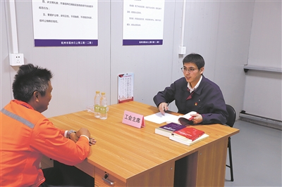 | 每月25日,郑刚都会在项目部劳动关系调解室里接待工人,倾听诉求,表达关怀。 |